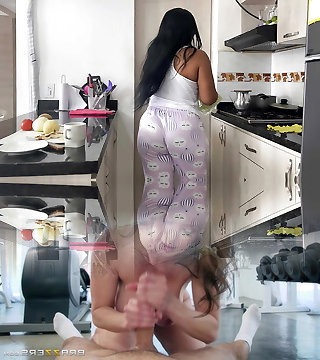 MILF step-mom enjoys making breakfast and screwing her big cock stepson.