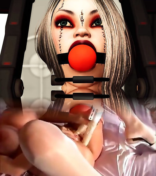 Ballgagged manacled woman gets pounded by black masked doll