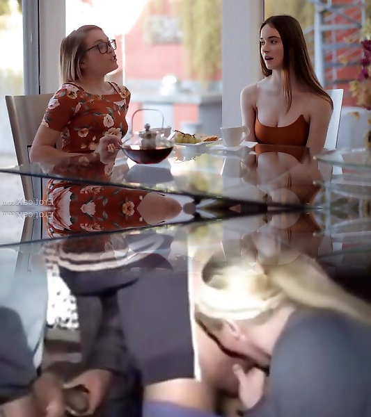 Mature blond and youthful black-haired lezzies