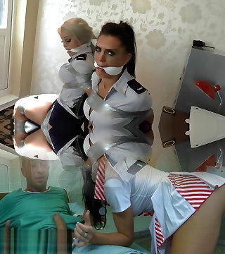 Submissive roped up blondie and brunette cowgirl get analfucked properly
