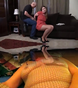 Submissive busty chubby wife in dark-hued stockings deserves some punishment