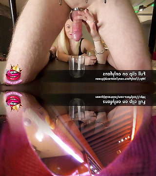Mistress empties subs pouch into a glass with multiple ruined ejaculations