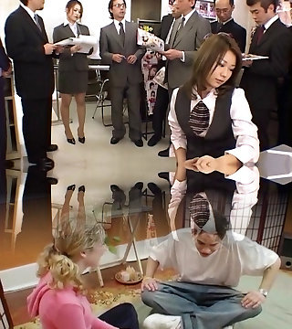 Hot Chinese milf getting her face fucked in a kinky office orgy